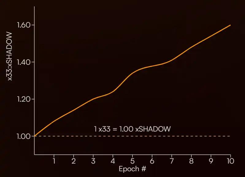 Shadow's design aims to eliminate the frictions in the ve(3,3) model, with managing voting positions being one of the biggest sources of friction. After xSHADOW is used for liquidity staking, it can mint $x33, which simplifies the process of automated voting and reward claiming without interfering with the core xSHADOW mechanism. The $x33:xSHADOW ratio starts at 1.00:1.00 and gradually leans towards $x33 as rewards from fees, voting incentives, and resets accumulate. At the end of each period, the rewards from fees and voting incentives will be automatically sold to increase the $x33:xSHADOW ratio. While $x33 provides instant liquidity, it cannot escape the exit penalty of xSHADOW. As a liquid staking version of xSHADOW, the market price of $x33 will naturally reflect the immediate exit fee structure and cannot trade below the redemption value of xSHADOW.