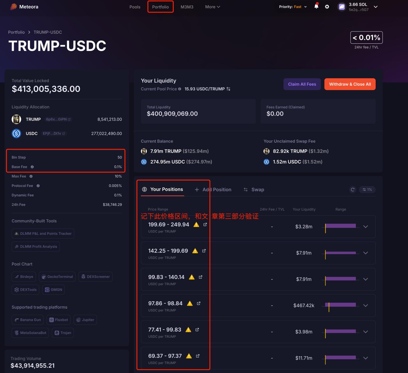 Finally, open Meteora, connect the Phantom wallet, and click [Portfolio] at the top to see all the added pools. Click on any DLMM pool, and it will show the details of the pool and all the positions, as shown in the figure.