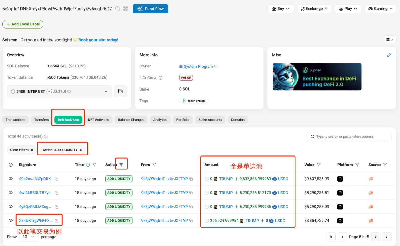 We open Solscan, enter the dev address of $trump (https://solscan.io/account/5e2qRc1DNEXmyxP8qwPwJhRWjef7usLyi7v5xjqLr5G7?activity_type=ACTIVITY_TOKEN_ADD_LIQ&page=5#defiactivities), open the [Defi Activities] tab, and filter the [Action] to "ADD LIQUIDITY". In the Amount column, we can see that all the listed liquidity addition transactions are single-sided pools, either only adding $trump or only adding $usdc. In this article, we will use the last transaction in the figure as an example.