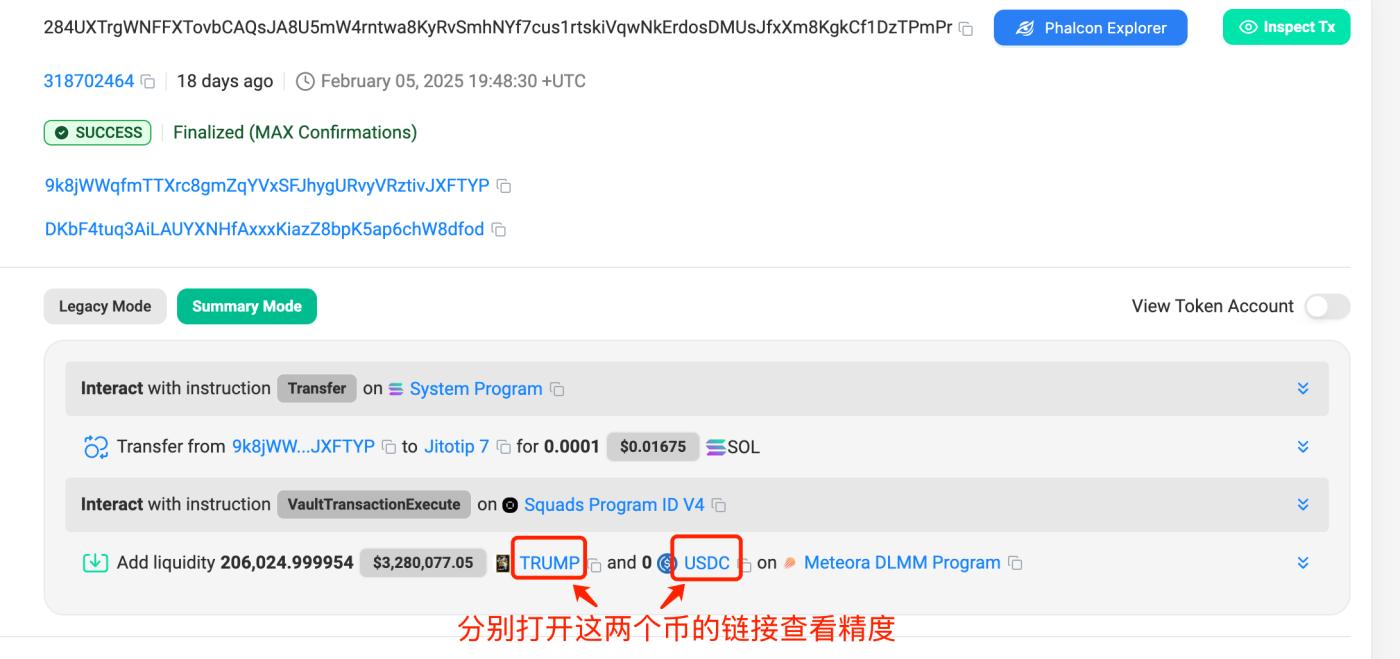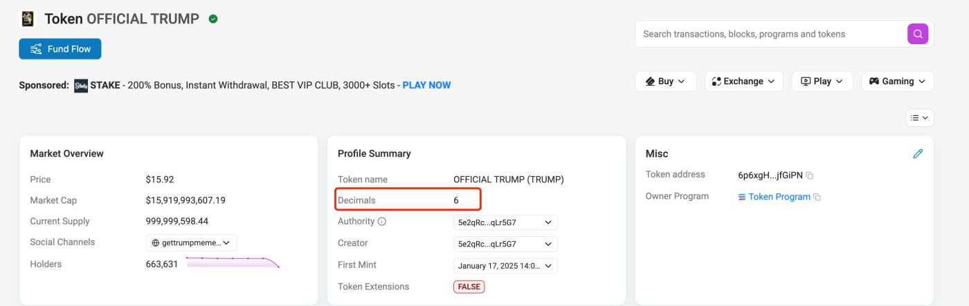 We open the links of $trump and $usdc respectively, and can find that the decimal of $trump is 6, and the decimal of $usdc is also 6, as shown in the figure.