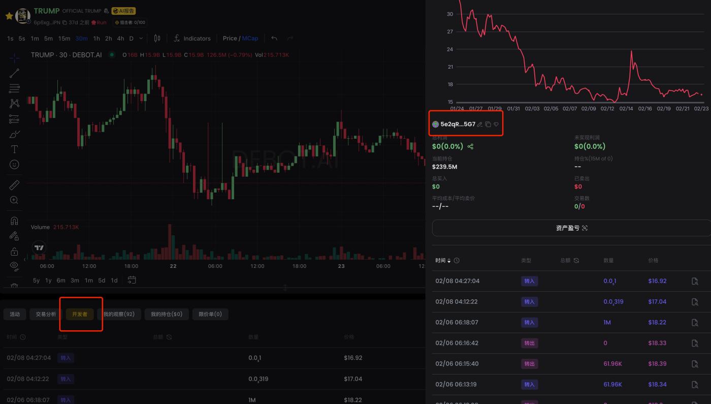 First, we open debot, enter the CA of $trump, and find the dev's address 5e2qRc1DNEXmyxP8qwPwJhRWjef7usLyi7v5xjqLr5G7, as shown in the figure.