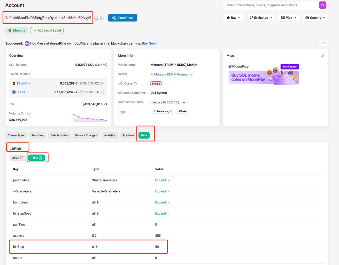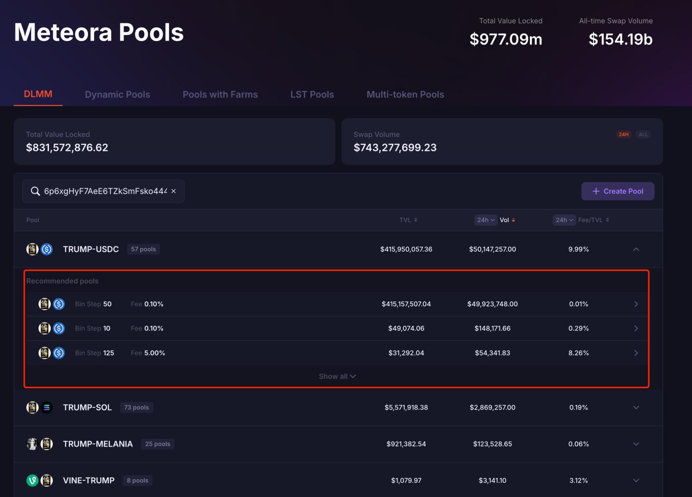 There can be multiple Pools under each trading pair, each Pool is distinguished by different Bin Step and Fee (transaction fee). For example, under the trump-usdc trading pair, there are 57 Pools, and each Pool corresponds to a unique address, as shown in the figure.
