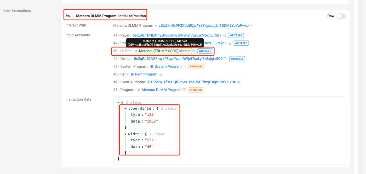In the transaction details page, scrolling down to【#4.1 - Meteora DLMM Program: initializePosition】, you can see that the lowerBinId is 1062, the bin width or count is 46, and the pool address is 9d9mb8kooFfaD3SctgZtkxQypkshx6ezhbKio89ixyy2, as shown in the image. From the above information, you can calculate that the upperBinId = lowerBinId + width - 1 = 1062 + 46 - 1 = 1107