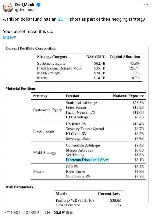 Recently, a mysterious institution's asset allocation table was leaked, and it is noteworthy that a "31 billion US dollar Ethereum short position" is clearly marked in the "multi-strategy" investment portfolio.