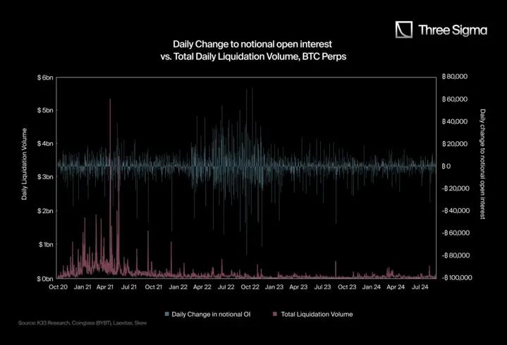 In the second chart, the author compared the total liquidation volume to the changes in daily Nominal Open Interest (OI).