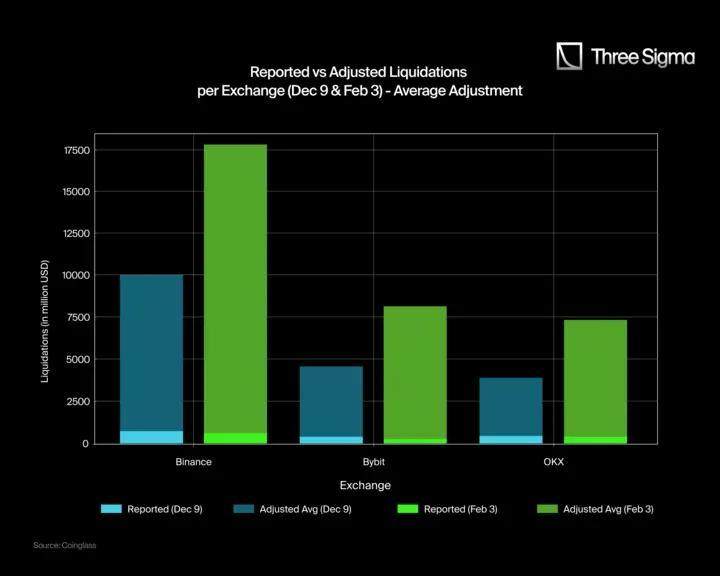 Bybit and OKX follow a similar pattern: Bybit's adjusted liquidation figure on February 3 is 8,150M, not the reported 247M; on December 9, it is 4,620M, not 370M. OKX also shows significant differences, with adjusted liquidation figures of 7,390M on February 3 and 3,980M on December 9, compared to their reported 402M and 425M, respectively.