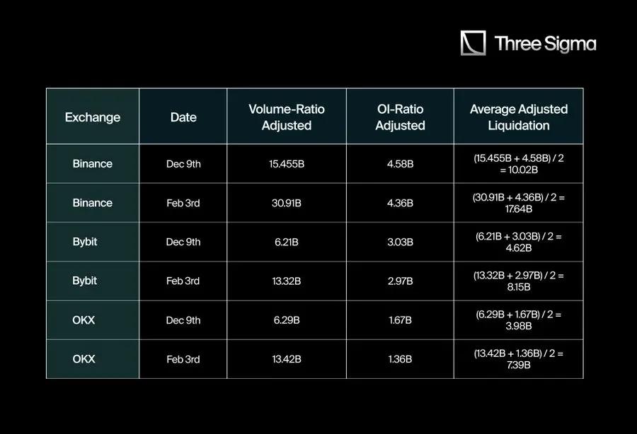 To estimate the "true" liquidation figures for CEXs, we use the Hyperliquid liquidation/trading volume ratio and liquidation/open interest contract ratio as benchmarks. We then compare these ratios to the data reported by CEXs on two specific dates (December 9 and February 3) to derive an adjustment factor.
