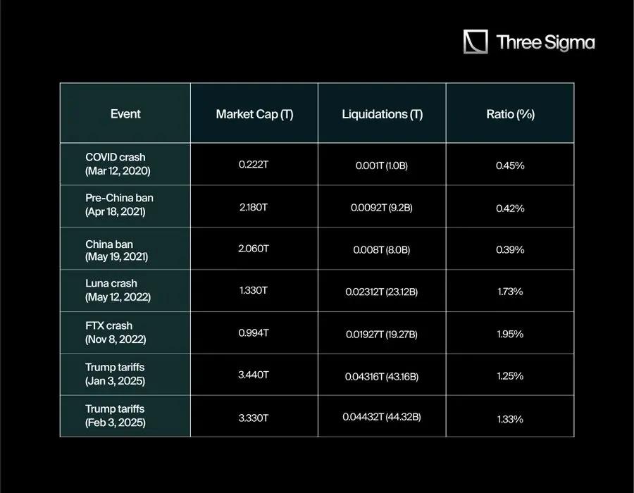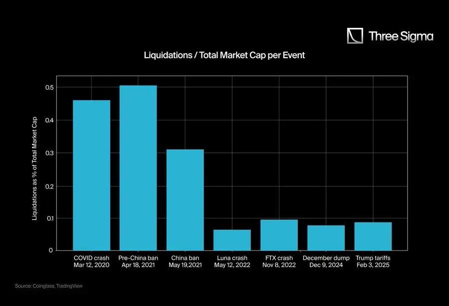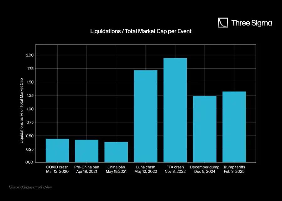 To provide more context, we compared the total "true" liquidations of these events to the total market cap at the time. The ratio calculation formula is: (Liquidation Amount/Market Cap) x 100.