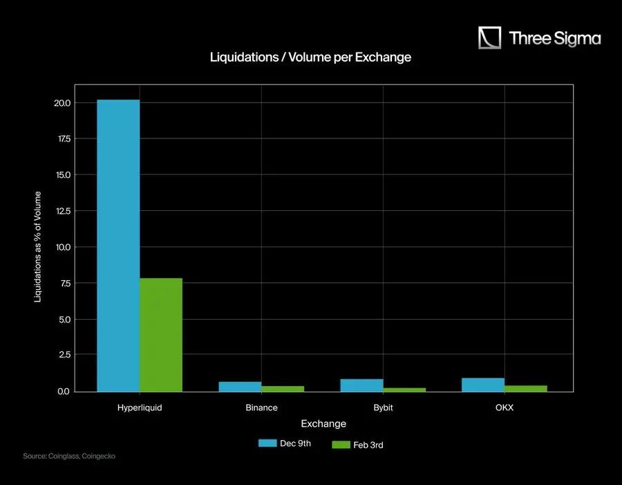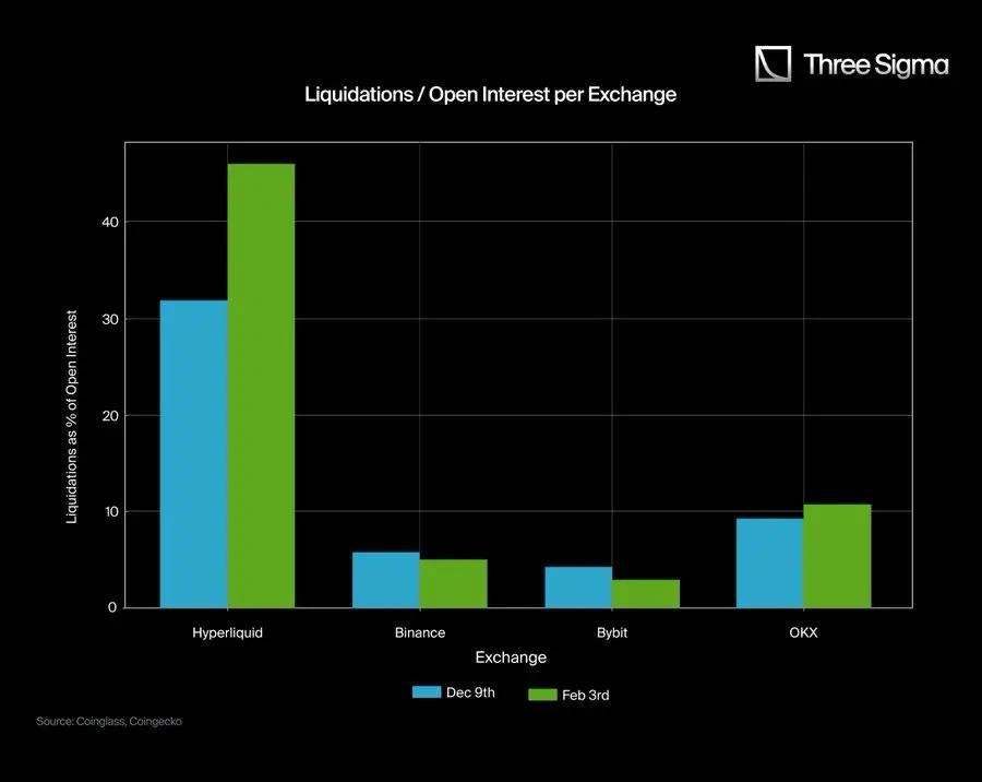 After comparing Hyperliquid's liquidation data with the limited data reported by major CEXs, we have found significant discrepancies. To quantify this difference, we collected the reported data from Binance, Bybit, and OKX on December 9 and February 3, specifically analyzing their liquidation/trading volume and liquidation/open interest contract ratios.