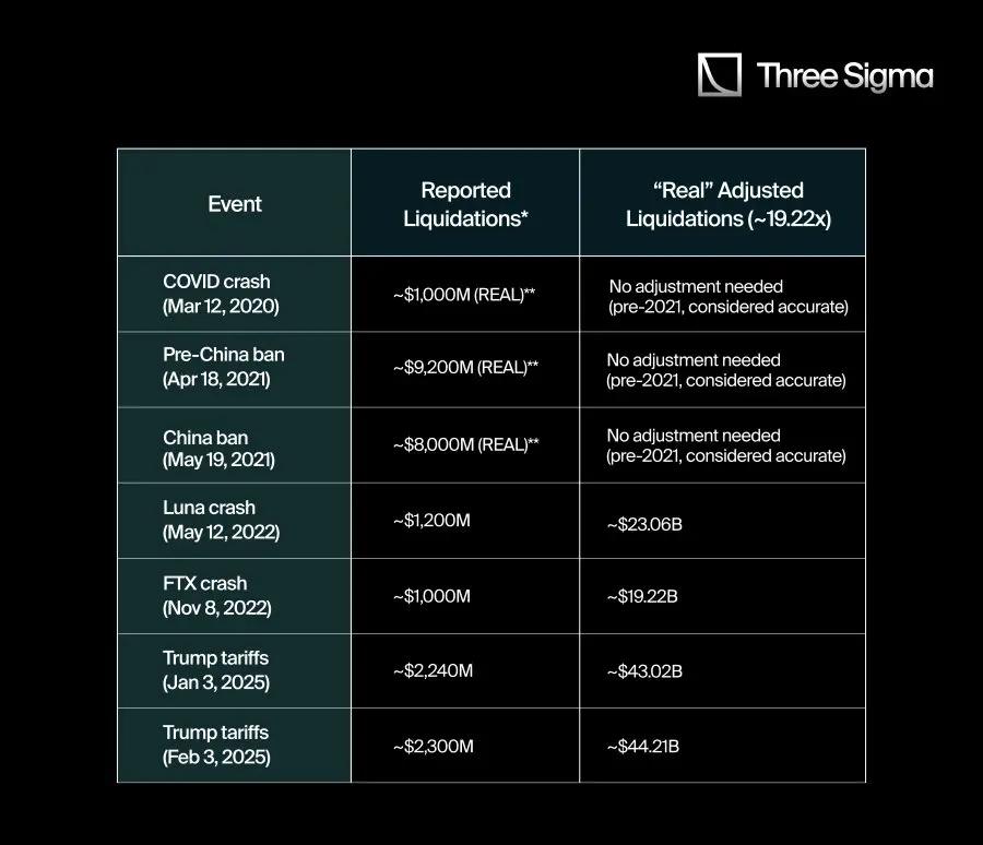 Here is the English translation:With this 19.22x adjustment factor, we analyzed some of the major liquidation events in crypto history to estimate what their true liquidation data might have been if they had the same transparency as Hyperliquid. The table below compares the commonly reported liquidation amounts with the values adjusted using the 19.22x factor: