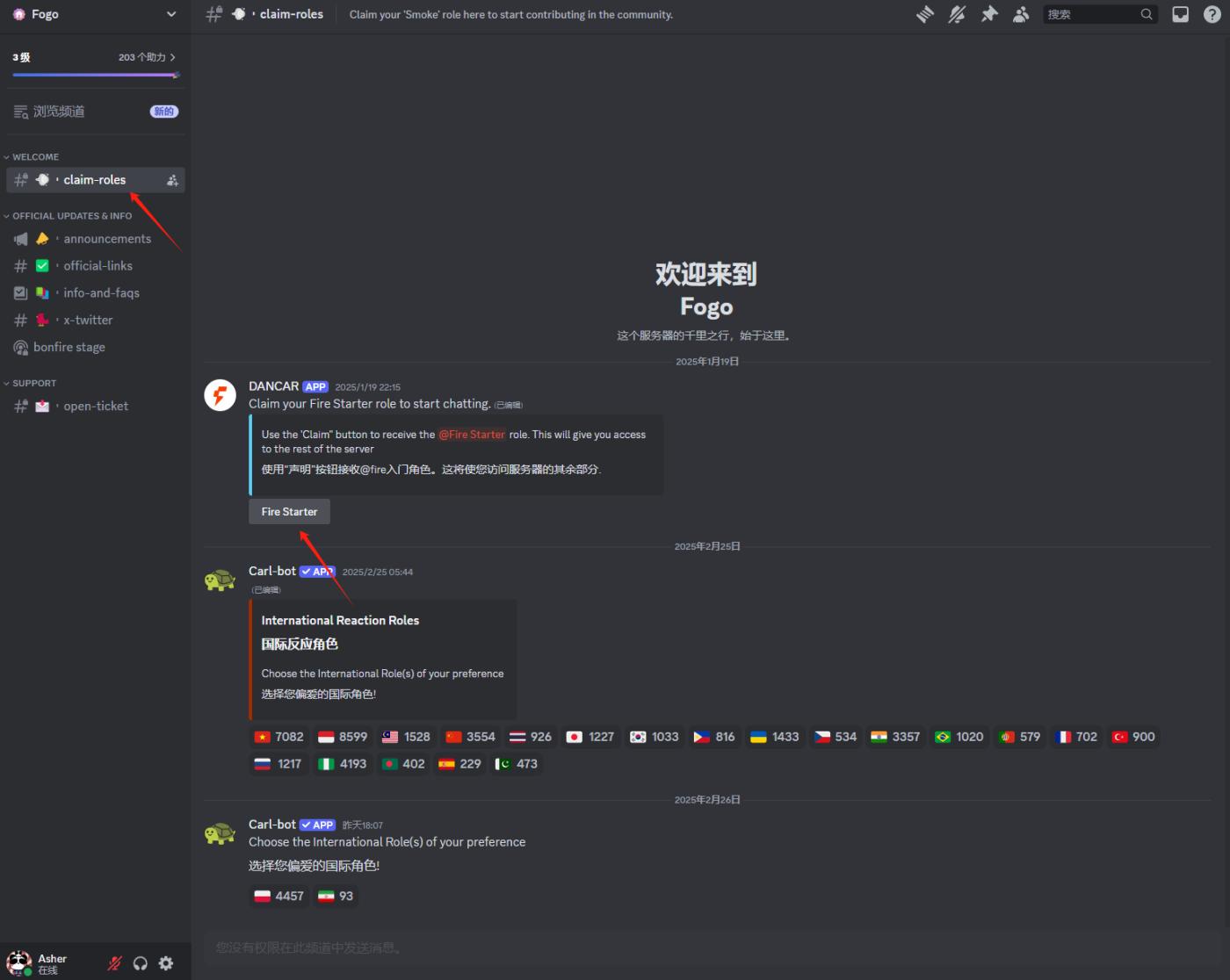 Currently, Fogo is in the early stage, and its Discord (link: https://discord.gg/fogochain) was just opened this morning. After entering, select "claim-roles" and click "Fire Starter" to get the early role.