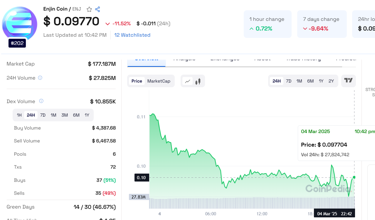 As of now, the live Enjin Coin price stands at $0.09770, with a 24-hour trading volume of $27.825 million.