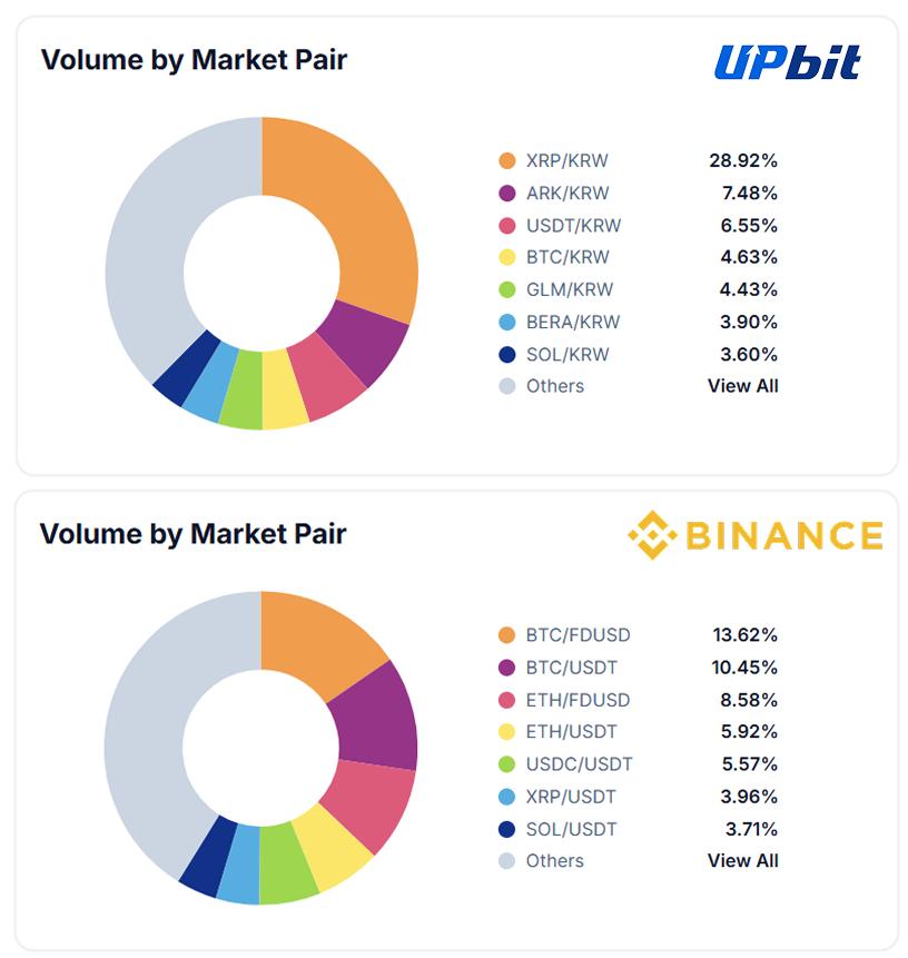 As of February 2025, Upbit's market share in the domestic Korean market has stabilized at 59%, and it continues to rank among the top 10 Altcoin exchanges with the strongest liquidity globally. It is worth noting that, unlike the global CEX, which mainly uses BTC as the main trading pair, the trading volume of the Korean cryptocurrency market is mainly concentrated in Altcoins (such as XRP). This has great appeal to project founders, so once a project announces a listing on the Korean exchange, the coin price will have an amazing surge in a short period of time.