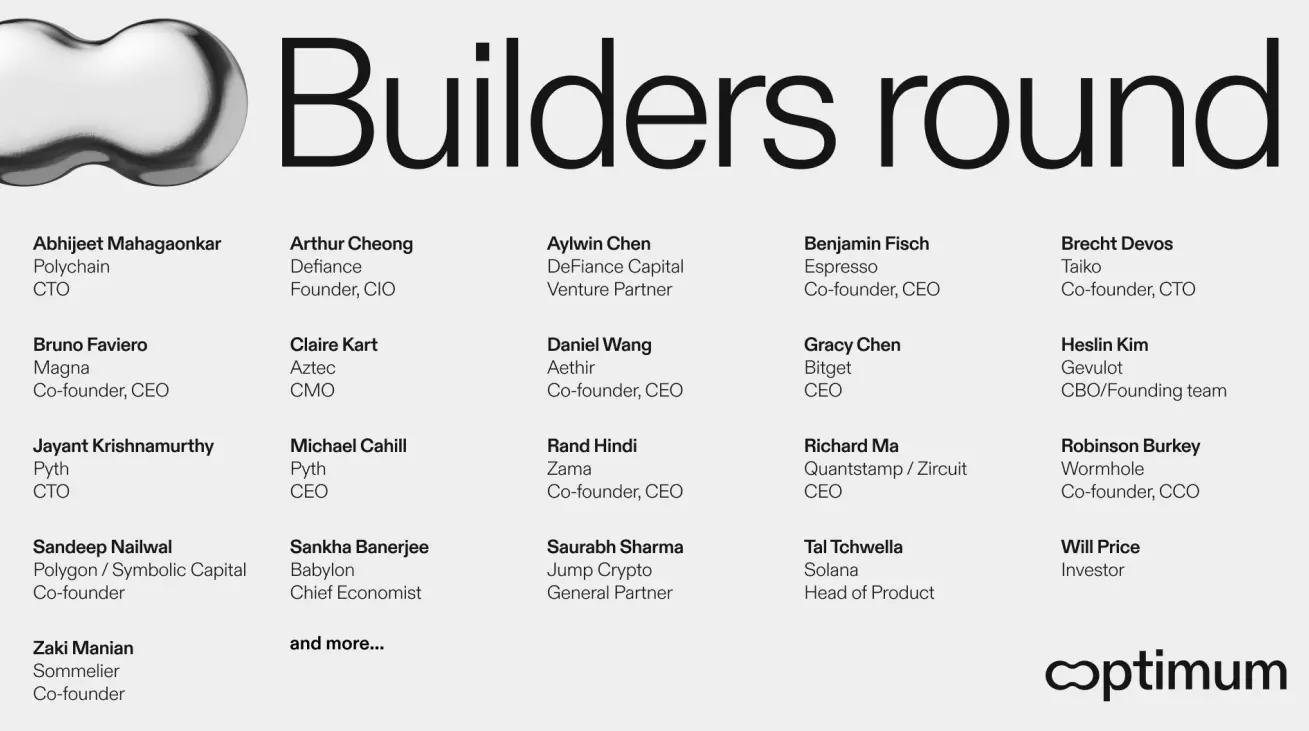 On February 28, the high-performance memory infrastructure for Bit blockchain Optimum announced the completion of angel round financing, with participation from well-known industry figures, including Polychain CTO Abhijeet Mahagaonkar, DeFiance Capital founder Arthur Cheong, Bitget CEO Gracy Chen, Wormhole co-founder Robinson Burkey, and Polygon co-founder Sandeep Nailwal.