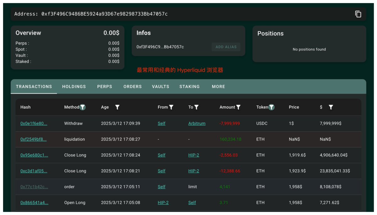 Currently the most commonly used Hyperliquid browser, although the UI is not as good-looking as HyperDash, it covers all the necessary functions, such as spot positions/futures positions/limit orders/vault positions/pledges/transaction records, etc. This tool is used for tracking large investors recently