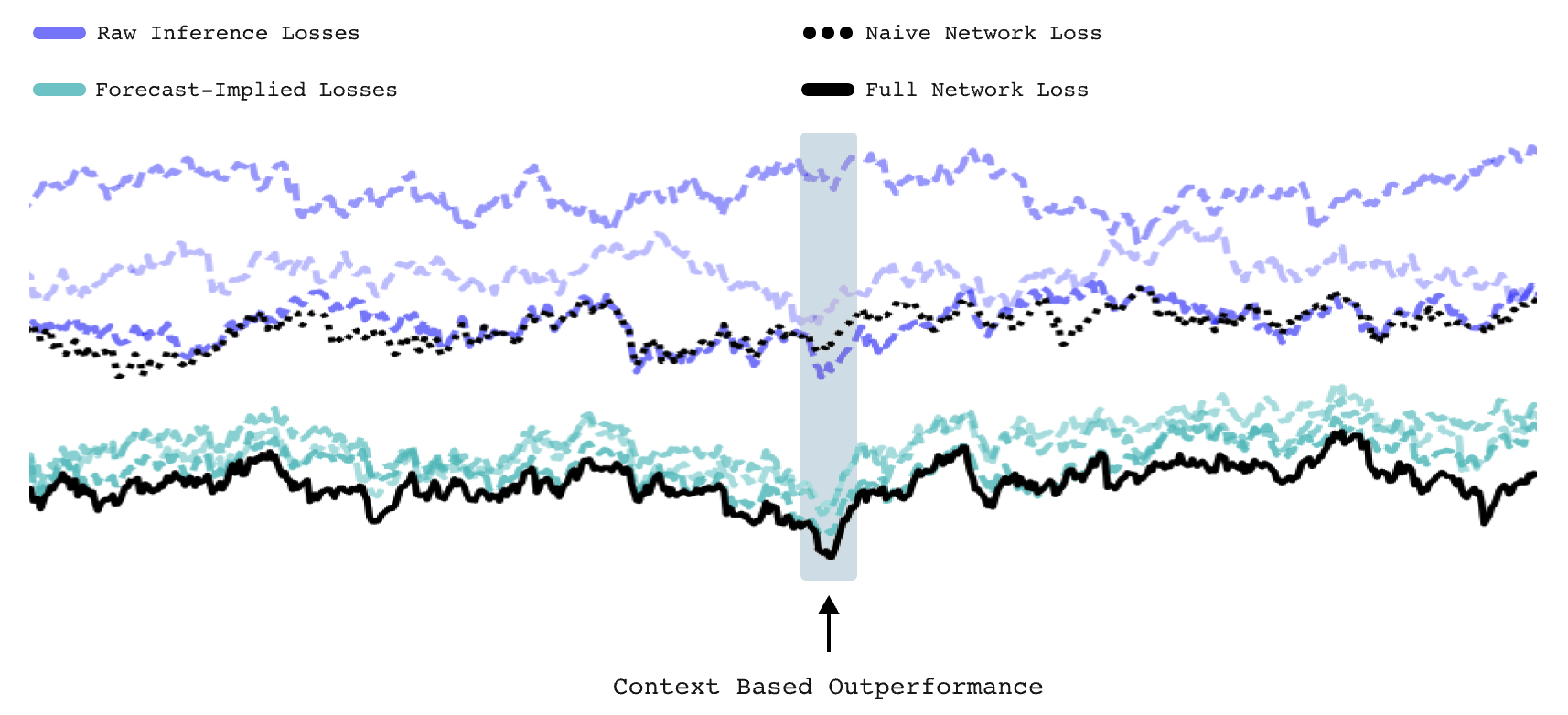 This "collective reasoning + mutual prediction" architecture makes Allora network's error rate (black solid line in the figure below) lower than traditional single models (black dashed line), by building a decentralized collective intelligence platform that allows dispersed models to learn from each other, creating an intelligence system that exceeds the individual.