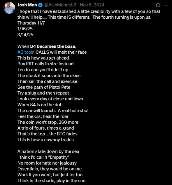 1️⃣ Josh Mandell, a legendary Wall Street trader, made a call on Nov. 6, 2024: When Bitcoin would base at $84K by Mar. 14, 2025, BTC would hit $444,000.