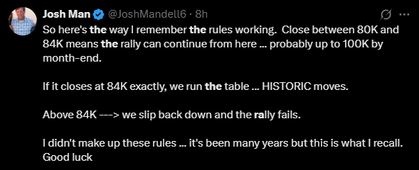 According to Josh, a close between $80K and $84K could signal more upside. Maybe even $100K by month-end🚨
