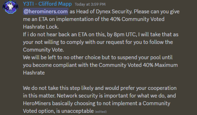We inform you with great sadness that we were given an ultimatum today by Dynex - limit our pool's hashrate to 40% or become blacklisted and banned from mining DNX.