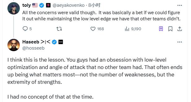 Haseeb then replied to Toly, "I think that's the lesson here. Your obsession with low-level optimizations and unique attack angles, which other teams lacked, is what mattered most. Doubling down on your strengths and mitigating your weaknesses is key. I completely failed to appreciate that at the time."