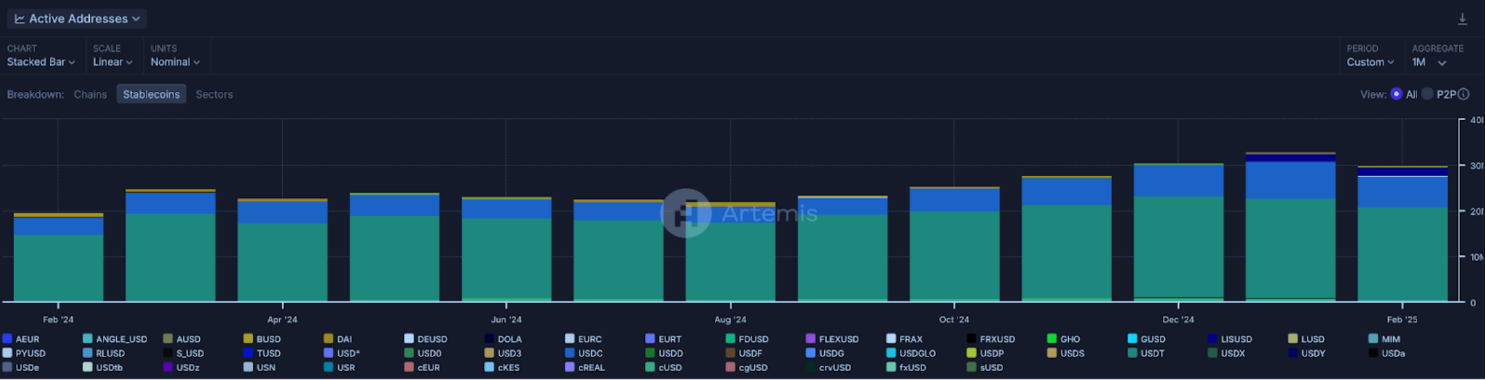 - USDT (Tether): The supply increased from $96 billion to $146 billion, but its market share declined to 64%, shifting its focus to P2P transfers.