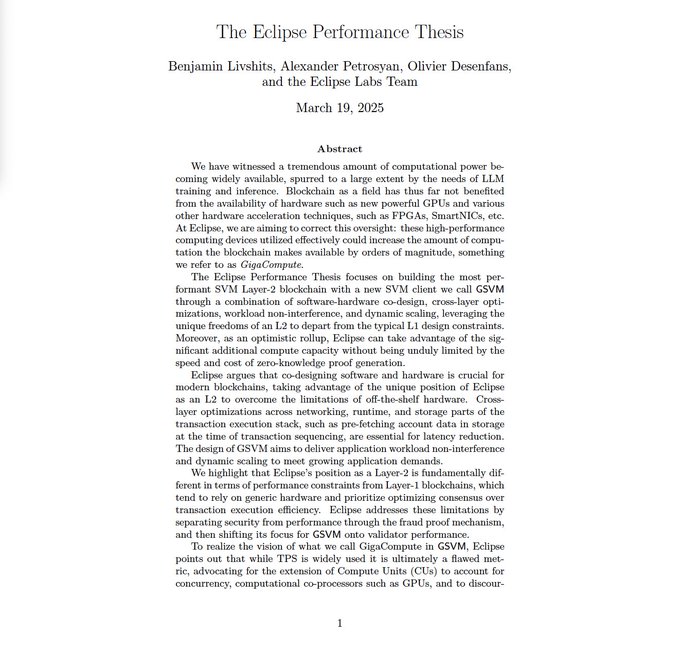 1/ The Eclipse Performance Thesis Eclipse is building the Giga Scale Virtual Machine (GSVM), a new SVM client. A software-hardware co-designed, cross-layer optimized, GigaCompute blockchain that eclipses all scalability limits and represents a paradigm shift in performance.