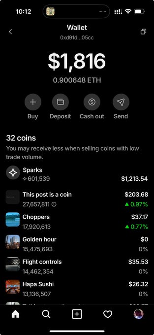 Finished my 30 day experiment posting on Zora, TLDR, I made 0.900648 ETH (~$1816) I made 32 posts, about one a day, and the majority of the money came from two posts: + This post is a coin + Choppers I didn't shill either of these posts (or any of them for that matter), it all