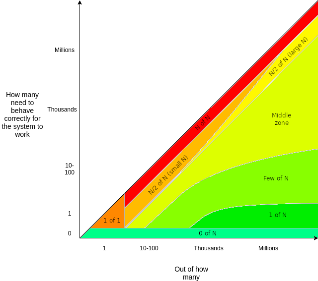 In @GCdePaula's new post on Ethresearch about Dave's fraud proof algorithm, it is shown how many honest actors are needed to ensure the normal operation of the system under different system architectures. In the above figure, from "1 of 1" (centralized) in the lower left corner to "N of N" (fully decentralized) in the upper right corner, the trust requirements of different fraud proof mechanisms vary.