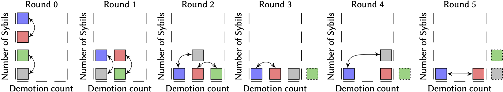 Round 0-2: Sybil accounts (blocks of different colors) start competing with each other, and the losers are demoted.