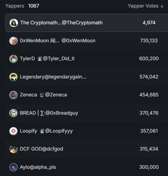 1067 Yappers voted, from big players like @0xWenMoon , @Tyler_Did_It , @legendarygainz_, @Zeneca , … to every single vote. Because yes, small streams make great rivers!