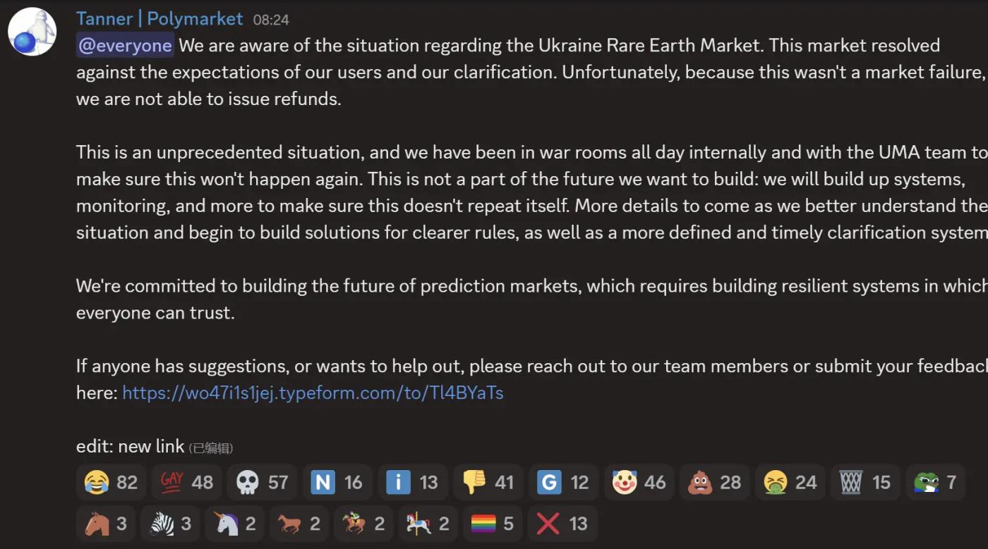 Polymarket officially posted an announcement on Discord after the incident, acknowledging that the ruling for the Ukrainian rare earth market deviated from user expectations and official clarification, but since this was not a failure of the market mechanism itself, the platform cannot provide refunds.