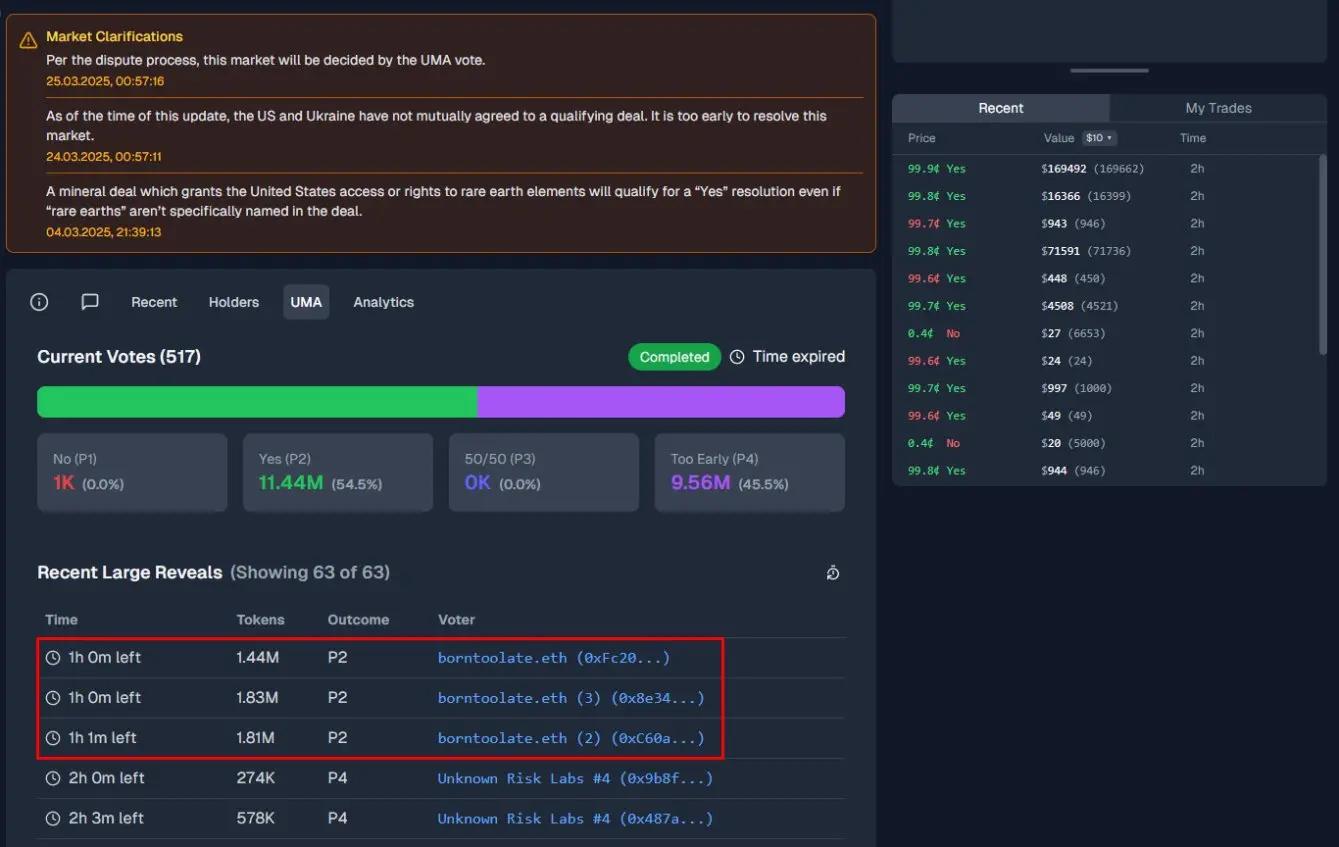However, the ruling power of the UMA oracle is concentrated in the hands of a few "whales" holding large amounts of UMA tokens. According to community analysis, just two large holders control over 50% of the voting rights, and they are not only voters but also players on Polymarket.