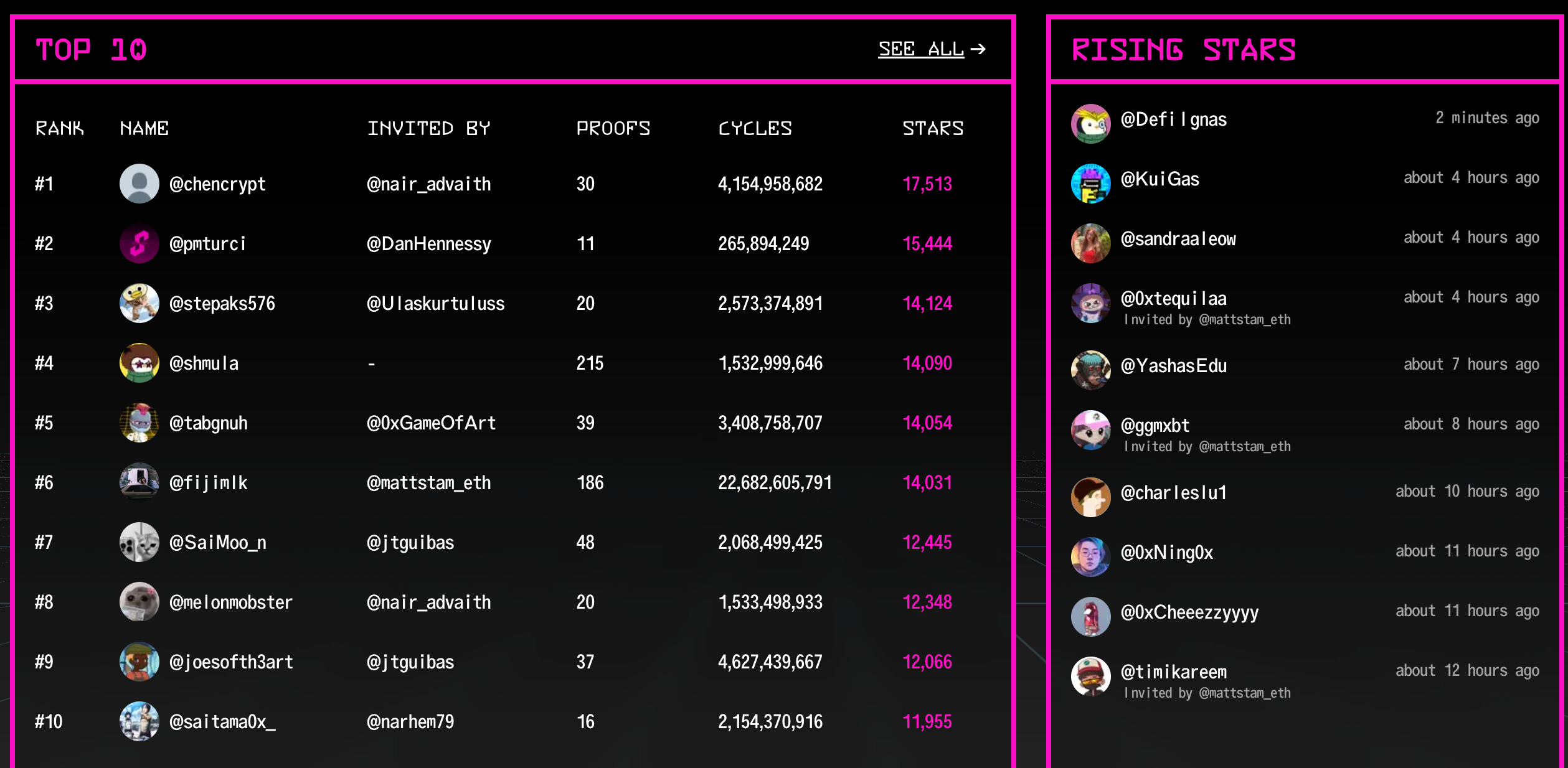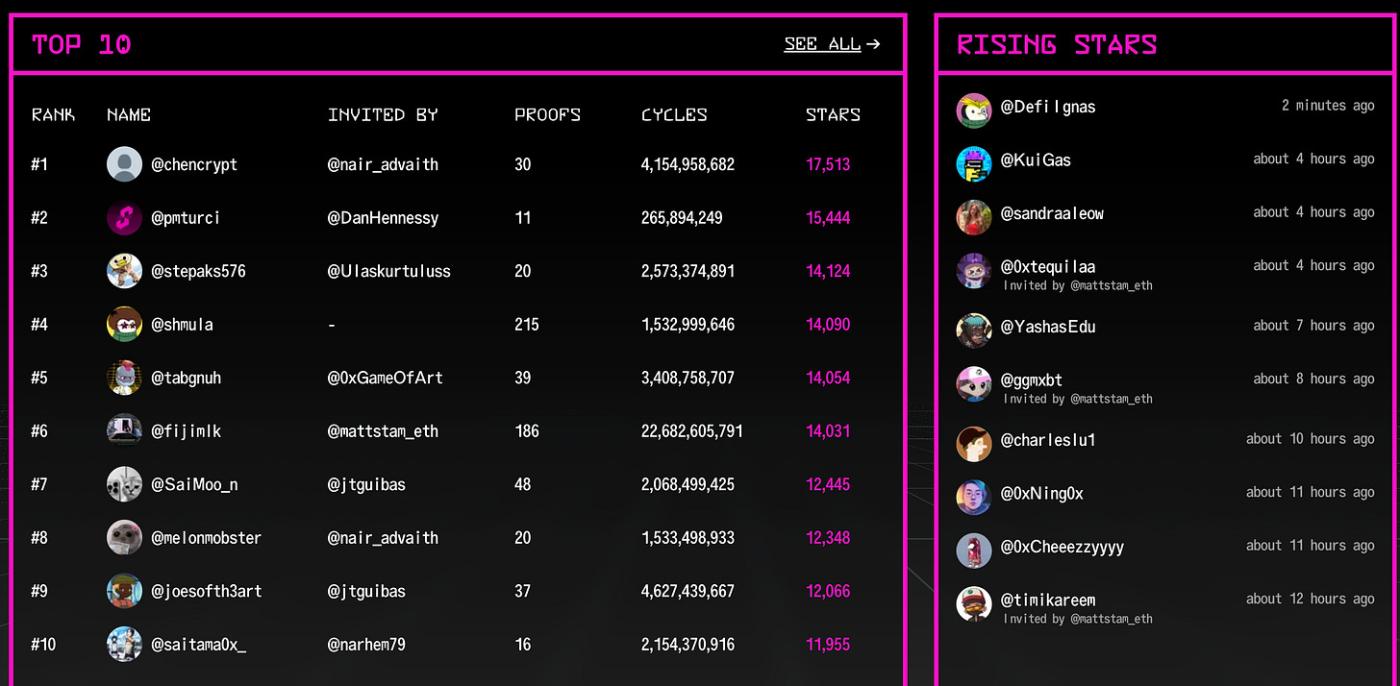 Their testnet, "Level 1: Crisis of Trust," launched on two months ago. You earn stars by generating zero-knowledge proofs. You need a $10 USDC deposit to cover proof generation costs. But to get an invite codes you’ll need to farm it on X, Discord, etc.