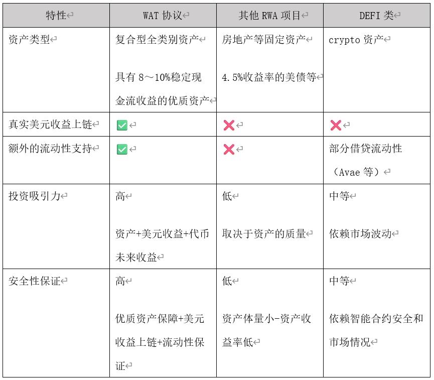From the table above, it can be seen that the WAT Protocol provides real yield and liquidity support while putting assets on-chain, filling the gaps in RWA projects and DeFi protocols, making it more competitive in the market.