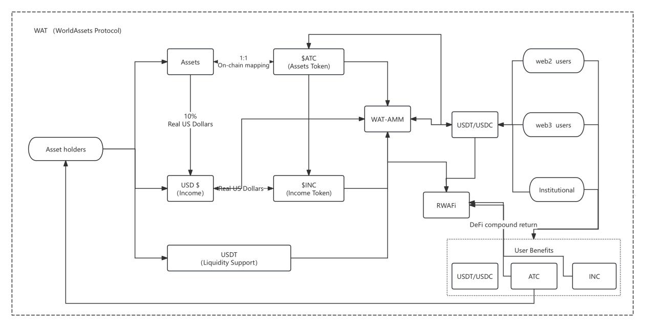 Requires traditional asset providers to provide the asset's real dollar yield. Through the foundation's WAT-AMM market-making mechanism, real dollars are injected, making the on-chain asset not just a mapping symbol ATC, but also injecting and supporting the issuance of real dollar yield Token INC. This allows investors to not only conveniently invest in high-quality physical assets through tokenization but also obtain the asset's real dollar yield and additional future yields from the INC Token.