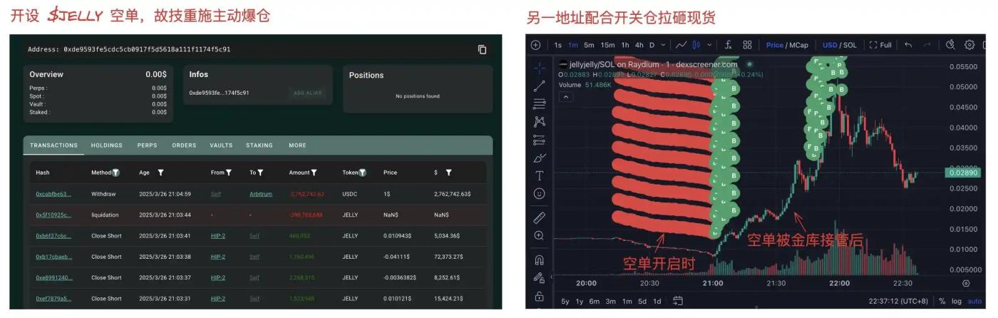 The attacker opened a $JELLYJELLY short position at $0.0095, simultaneously selling spot to lower the price, making the short position appear profitable.