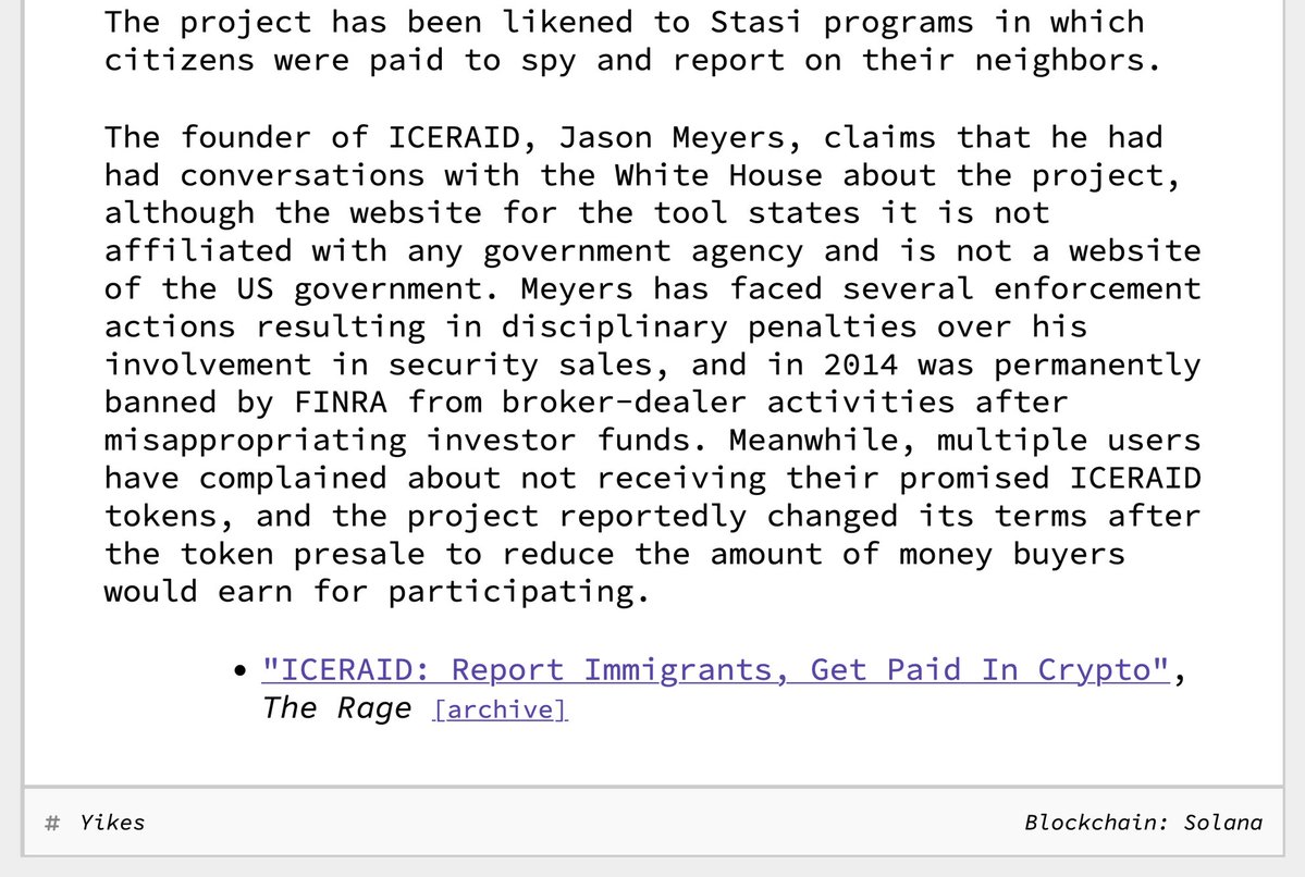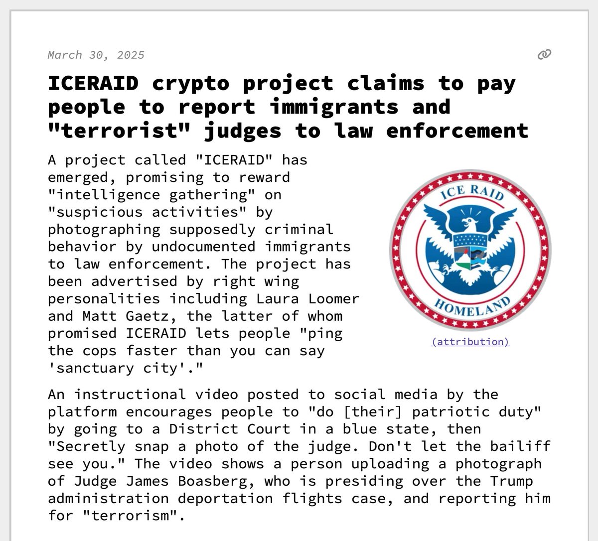 ICERAID crypto project claims to pay people to report immigrants and "terrorist" judges to law enforcement