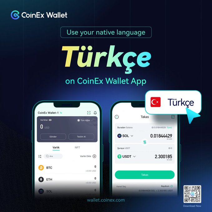 CoinEx Wallet now supports Turkish🇹🇷 You can easily switch to your preferred language: Me >> Preferences Settings >> Language. Experience a seamless journey with CoinEx in Turkish! Grab it today 👉 wallet.coinex.com/en/download #CoinExWallet #NewFeatures