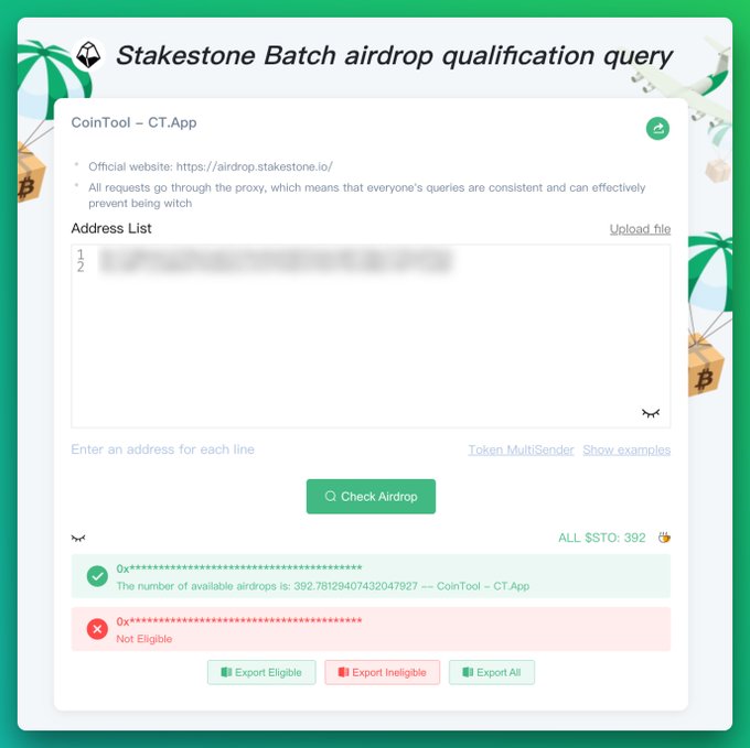 New Airdrops - Stakestone batch airdrop qualification query 🔗 ct.app/airdrop/stakestone… Keep building ⚒️ @cointool @Stake_Stone #Stakestone #STO #Airdrops #CRYPTO #CoinTool $STO