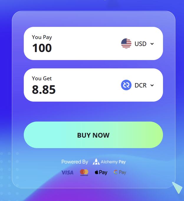 BIG NEWS! Decred now has a fiat on-ramp via @AlchemyPay! Buy directly with debit/credit card, Google pay, and Apple pay. I just tested it and it worked fast.