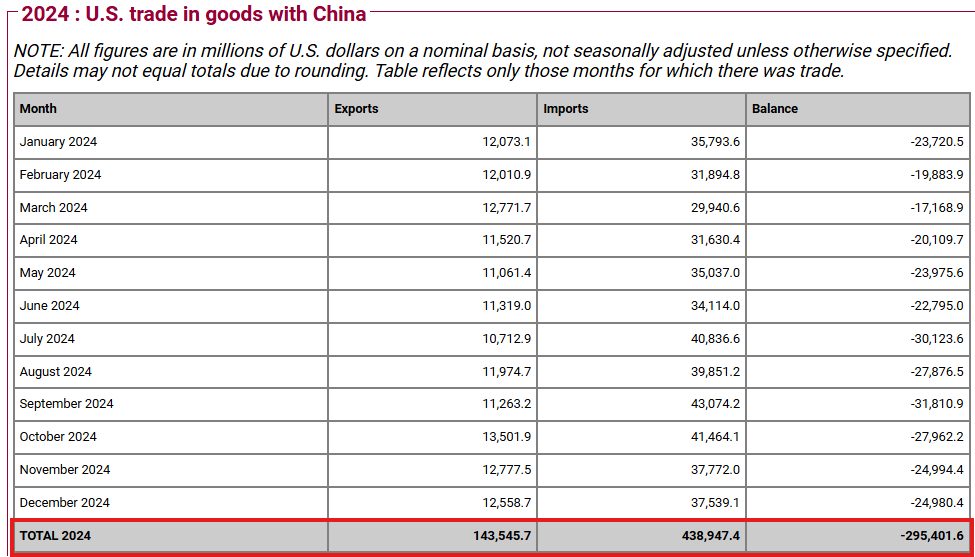 In 2024, the US imported $439 BILLION from China while China imported $143 billion from the US.