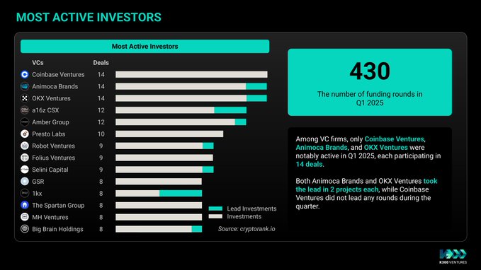 Among VC firms, only Coinbase Ventures, Animoca Brands, and OKX Ventures were notably active in Q1 2025, each participating in 14 deals.