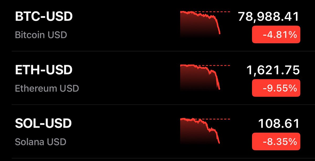 🚨 BREAKING: The crypto selloff continues with Bitcoin falling below $79,000 and Ethereum about to break under $1,600. Solana at the $100 psychological stronghold.