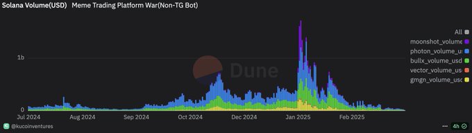 Meme trading platforms have seen a insane >98% drop in volume since TRUMP Day. The five mainstream platforms (Photon, BullX, GMGN, Moonshot, Vector) on Solana are now pulling less than $30M daily combined.