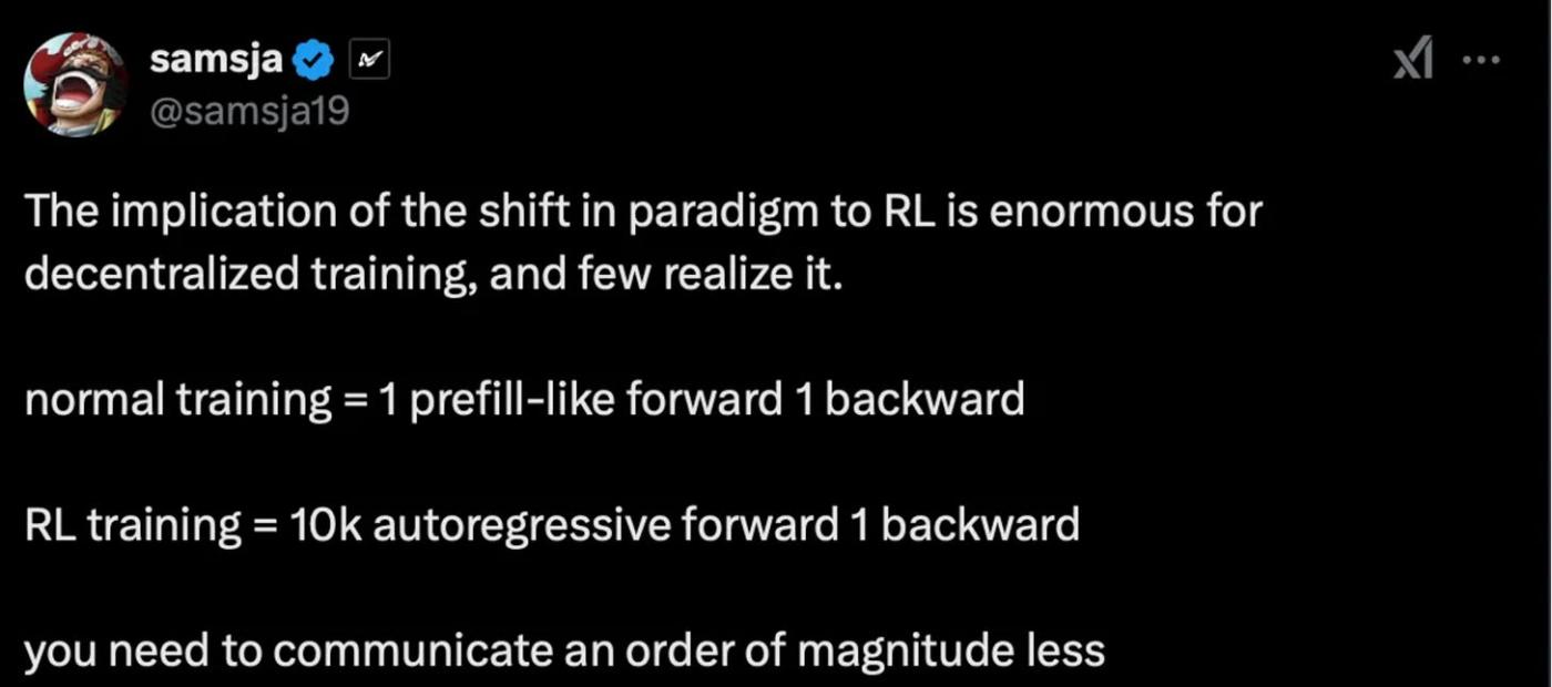 The fun part with reasoning models and improvements in the post-training phase stem from the reality that these processes are inherently less intensive in communication requirements during the pre-training phrase. Samsja points out the RL & normal training’s order of magnitude difference in forward pass count.