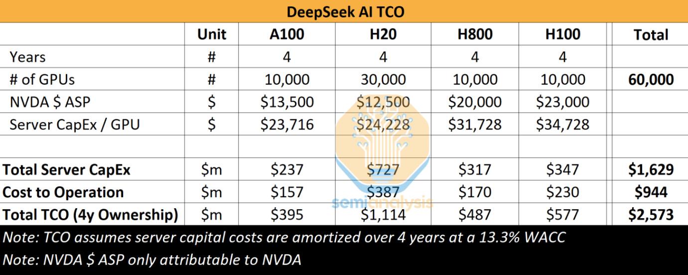 It’s been said that R1 was trained with 2,048 Nvidia H800 GPUs which comes out to roughly $61 million worth of GPUs assuming a cost of $30,000/GPU - give or take $5,000 depending on where and when DeepSeek acquired these. However, there’s also a difference in reporting based on numerous internet sources for the above and a report from semianalysis which estimates 10,000 H800s and 10,000 H100s.