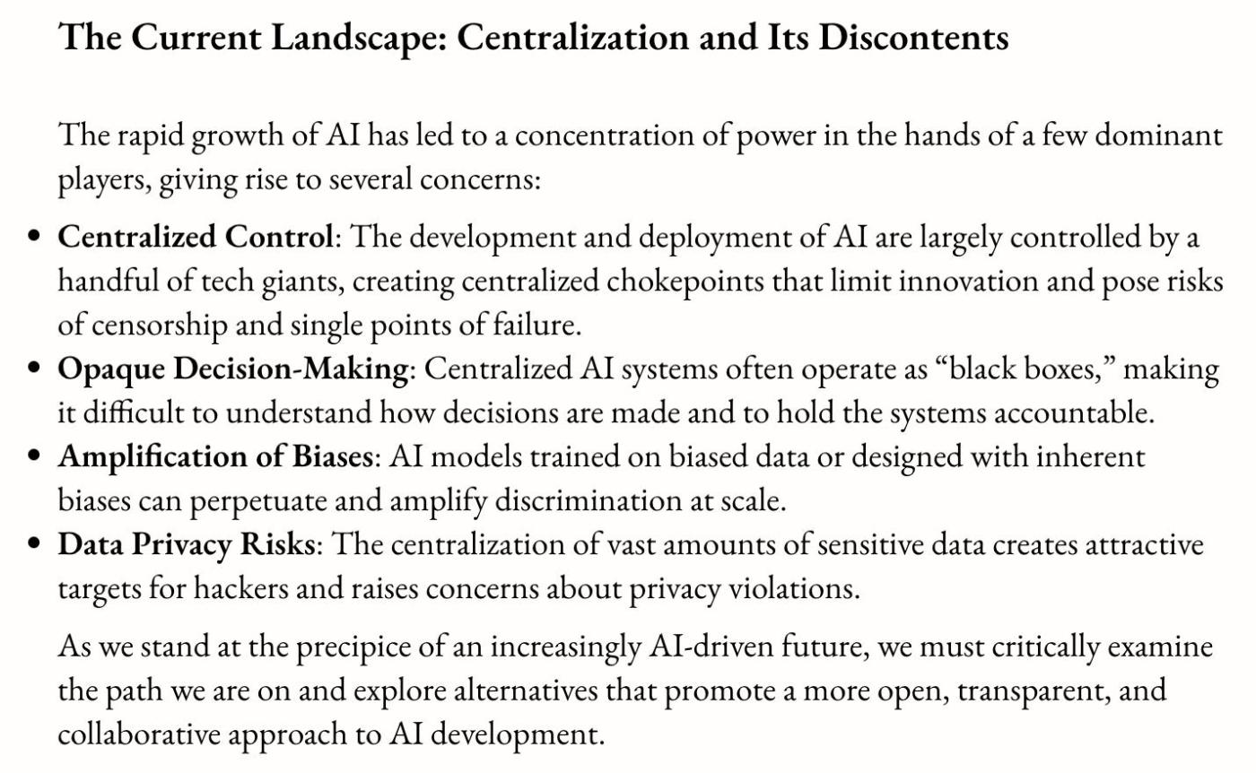 It seems most in the industry are attracted to the challenge of decentralizing AI because they love decentralization, but more than that, it’s a pressing issue for a lot of humans.