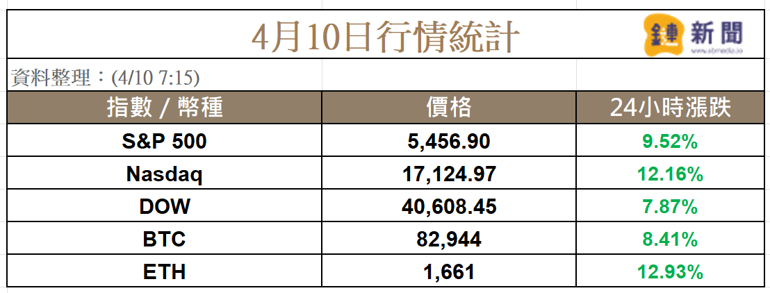 U.S. President Trump's 90-day suspension of punitive tariffs triggered a sudden reversal in asset prices, with the S&P 500 index surging nearly 10%, and the Nasdaq Composite recording its largest gain since 2001. Cryptocurrencies subsequently rose, with Bitcoin returning to around 83K, Ethereum rising nearly 13%, but the Coinglass Fear and Greed Index remains at an extreme fear level of 18.