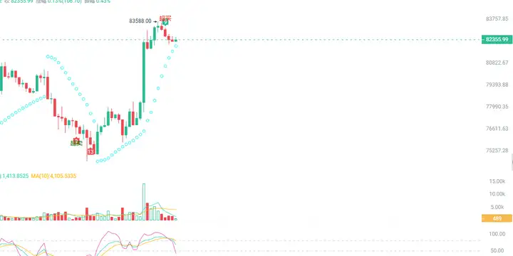 Mainly influenced by Trump's 90-day tariff suspension, US stocks and cryptocurrencies surged together, with BTC touching 84,588 and ETH reaching 1,689 in the early morning. This surge was not unexpected. The previous two days saw rumors of tariff suspension, followed by denials, which felt like a smokescreen. However, the market is fragile, easily affected by negative news. Yesterday's early report emphasized that 7.5 cannot determine the bottom, but it was an excellent value position, currently with a 10% increase. $83,000 has transformed from a strong support to a strong resistance. We'll observe the breakthrough situation during the day.