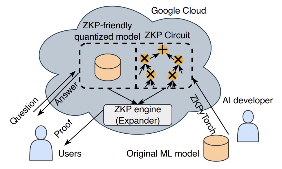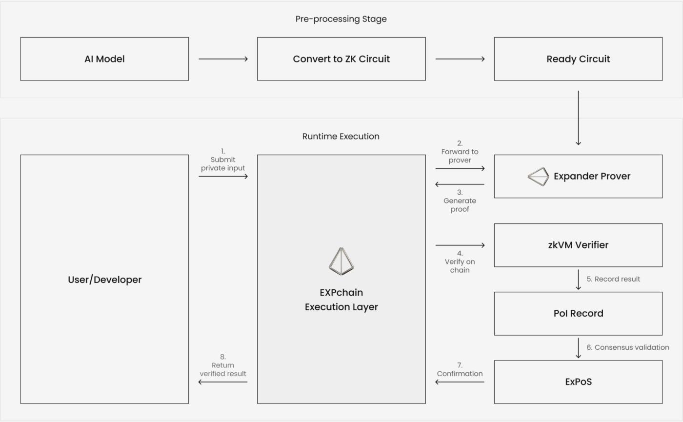 In this system, AI developers first train a regular machine learning model and then use a framework such as zkPyTorch to convert it into a "ZKP-friendly" quantized version suitable for ZK circuits. When a user submits a question, the question is processed by the ZK circuit, performing multiplication and addition operations on the parameters through the model logic. Then, the ZKP engine (such as Expander) generates the corresponding cryptographic proof. Users can not only get the answer returned by the model, but also get a proof that can be verified on-chain or locally to confirm that the answer does come from the authorized model without disclosing any private details of the model.